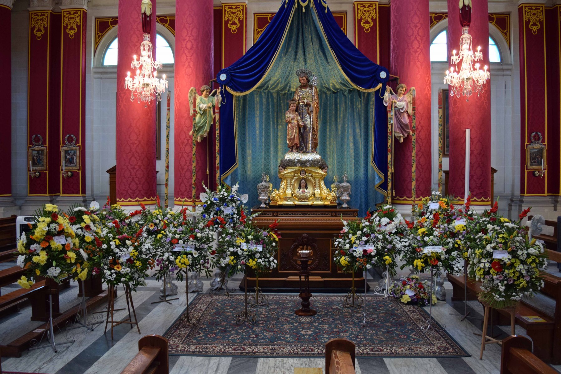 Sunday: In the morning, a solemn mass is held in the Parish Church were parishioners and guests attend in glory of Saint Joseph. After, the two band clubs organises their own band marches with the cheering, singing and clapping of the crowds and enthusiasts. In the evening, the procession of Saint Joseph is held throughout the roads of Kalkara, everybody dresses in their fine clothes for the occasion. The fulcrum of the procession is reached when the devotional station of Saint Joseph is back on the parvis and inside the church, enthusiast and parishioners alike clap, sing and pray sonnets infront of the statue with great devotion. The celebrations came to an end with the blessing of the eucharist.