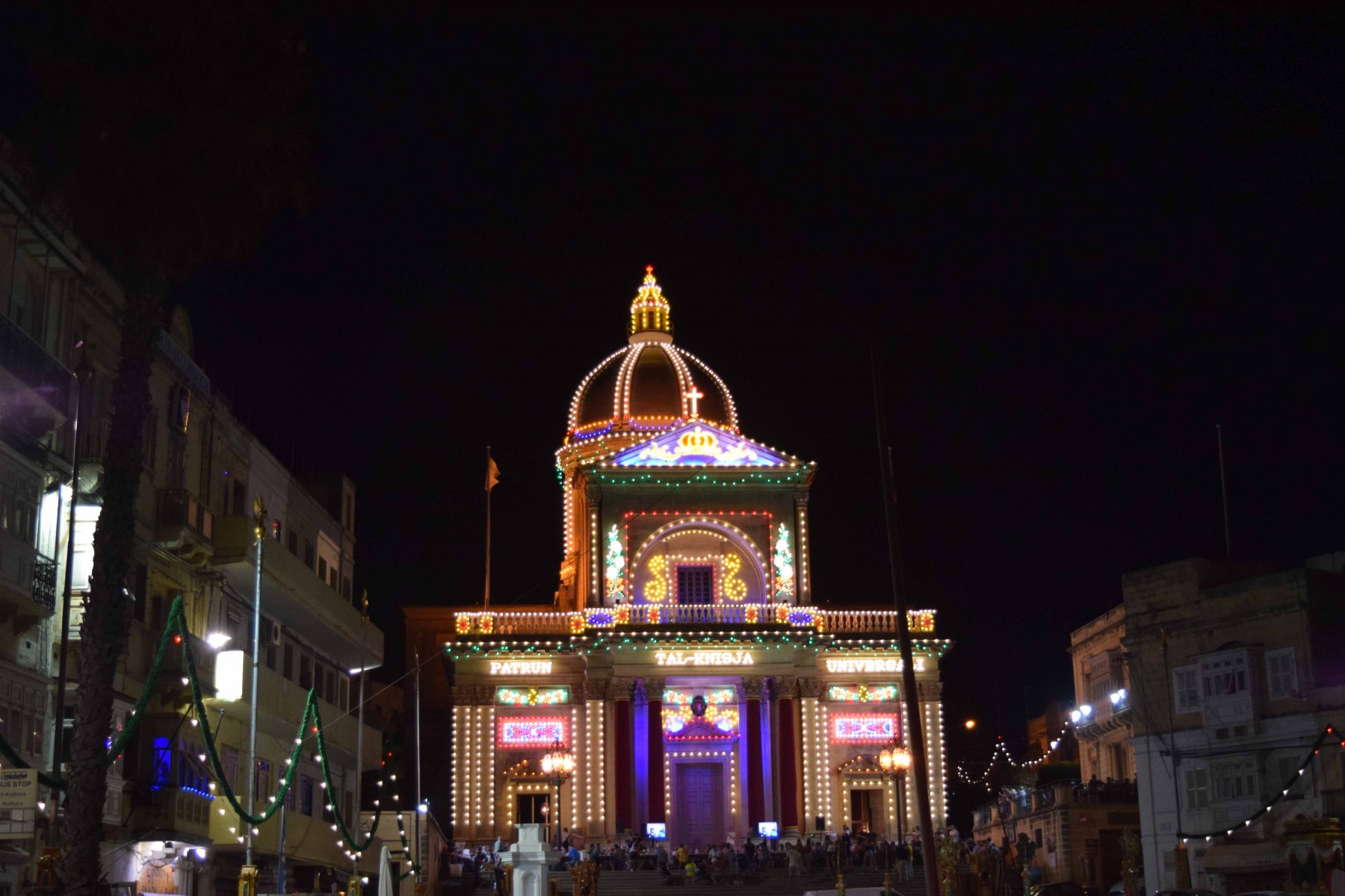 Homes are looking their absolute best, often benefitting from a fresh coat of paint a few weeks before, in preparation for the feast. The interiors may be glimpsed through the open doors and windows, unless your curiosity gets rewarded by an invitation from the family to come inside for a closer look and a drink! The facades are decorated with colourful drapes handing to the balconies. During the day; flags are flying while during the night blue or red lights are raised on the several flagpoles located on house roofs around Kalkara. The roads are decorated with light, drapes, paintings and statues on pedestals. The evenings often end with spectacular ground and aerial fireworks displays in an explosion of colour, firecrackers and loud petards.
