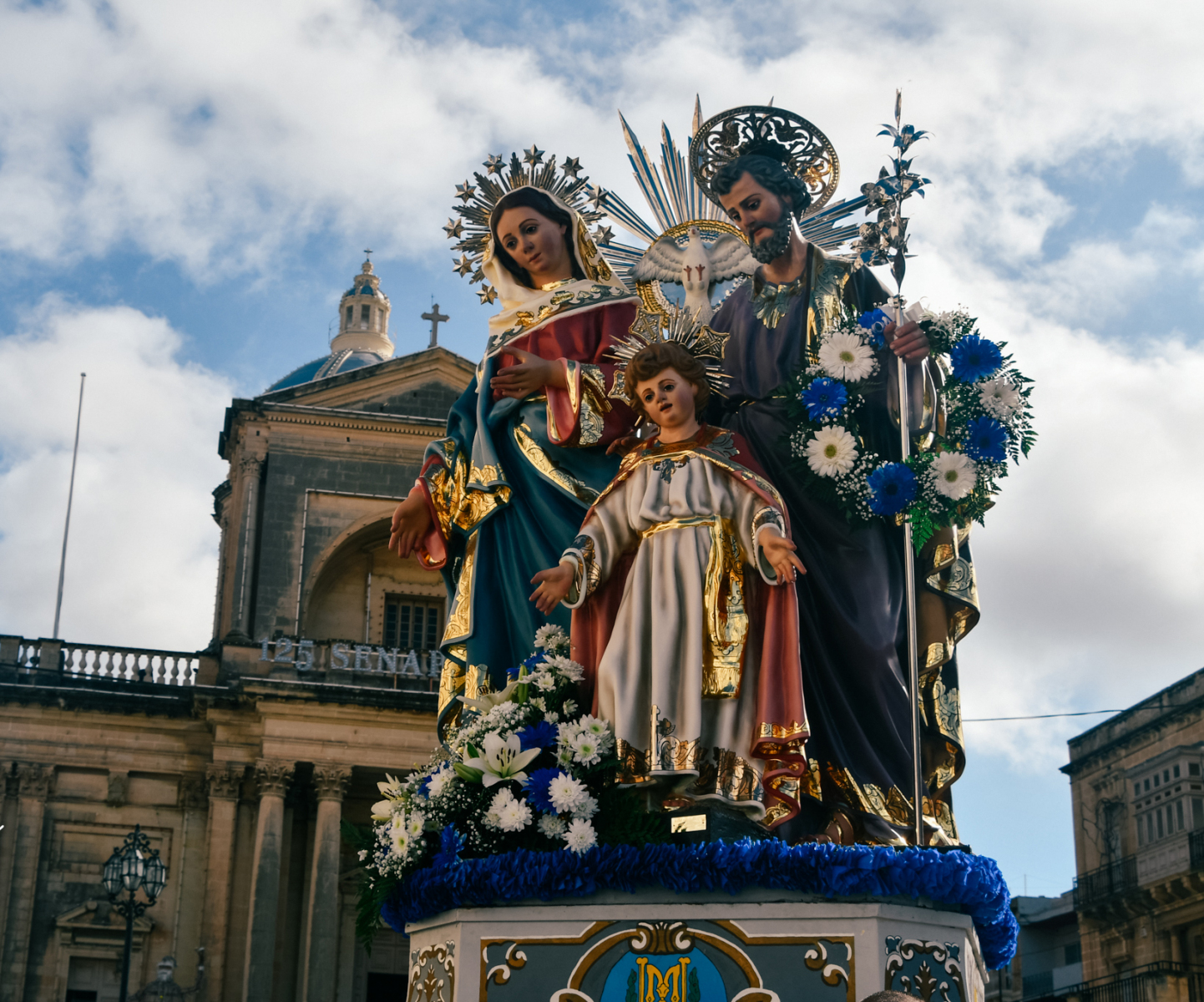Wednesday: A band march is organised by the band club ‘Circolo San Giuseppe Filarmonika Sagra Familja’ in the upper parts of the village carrying a statue shoulder-high (replika to the old statue of Saint Joseph which was unfortunately destroyed during the WWII) of Saint Joseph. A parade is held by the enthusiasts when the march reaches the vicinities of Kalkara Creek taunting the rival band club with cheering, singing, marches and sonnets. By the end of the march, the statue is raised on a pedestal in Holy Family Square opposite of the band club with pomp, paper cannons, fire crackers and aerial fireworks.